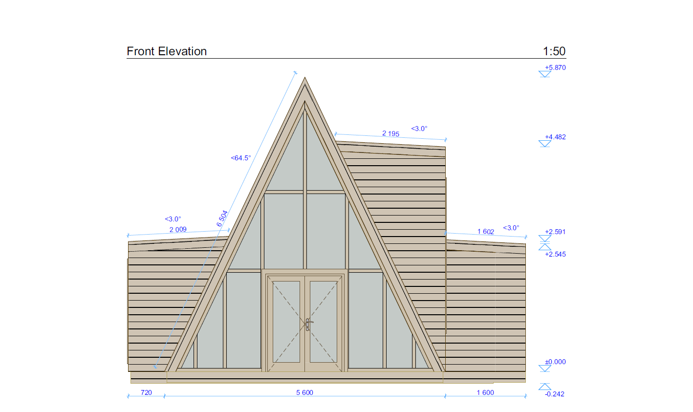 A-Frame Maxi 39 m² má sklenené steny vpredu a vzadu, ktoré ponúkajú úžasný výhľad a silné spojenie s prírodou. Jeho priestranný a funkčný dizajn zahŕňa podkrovie, ktoré optimalizuje priestor a poskytuje útulnú atmosféru.
