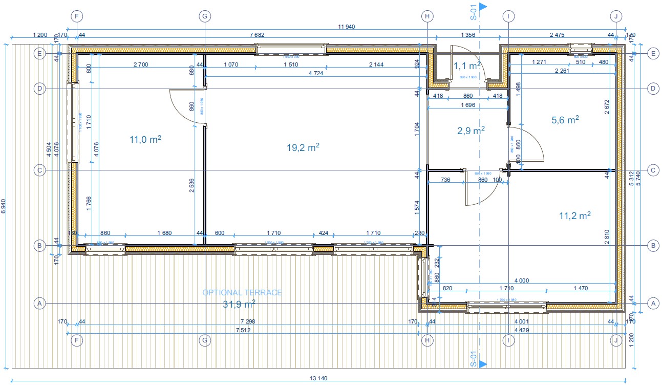 Tento moderný, plne izolovaný drevený dom má inteligentné usporiadanie v tvare L s dvoma spálňami, kúpeľňou a otvorenou obývacou časťou, všetko obalené v elegantnom vertikálnom obklade – ideálne pre celoročné bývanie, rekreačné prenájmy alebo kompaktné moderné domy. Jeho čistý dizajn, efektívne využitie priestoru a veľké okná ho robia štýlovým a vysoko funkčným.